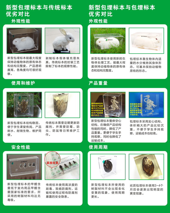 新型包埋標(biāo)本的特點 ◆輕盈便攜、透明直觀:產(chǎn)品為空心結(jié)構(gòu),輕便易觀察。 ◆安全環(huán)保、自然真實:使用包埋材料和封裝材料環(huán)保安全。先進(jìn)的動植物干燥處理工藝,不破壞動植物的原有的整體結(jié)構(gòu),更完整,更逼真。 ◆長久保存、性價比高:高分子材料滲透包裹處理,更經(jīng)久耐用?招慕Y(jié)構(gòu)降低產(chǎn)品的重量,性價比更高。 |